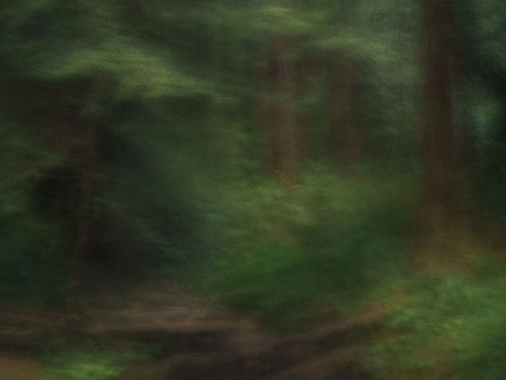 A photographic impression captured in-camera using ICM methods. The image shows a nearly empty river surrounded by dense vegetation and towering redwoods in a painterly way.