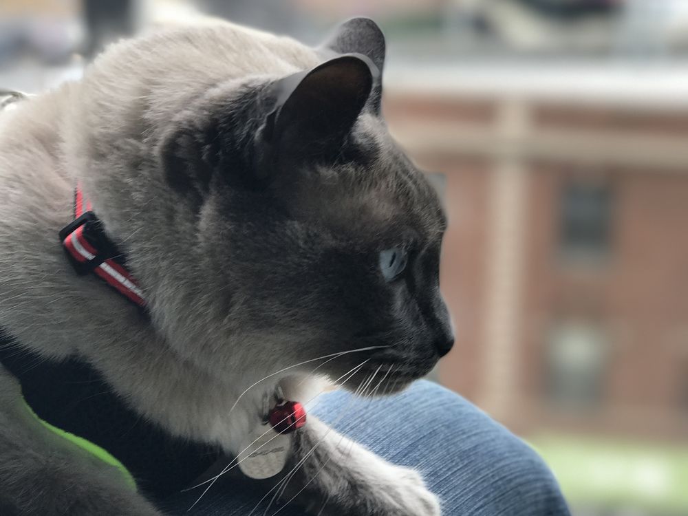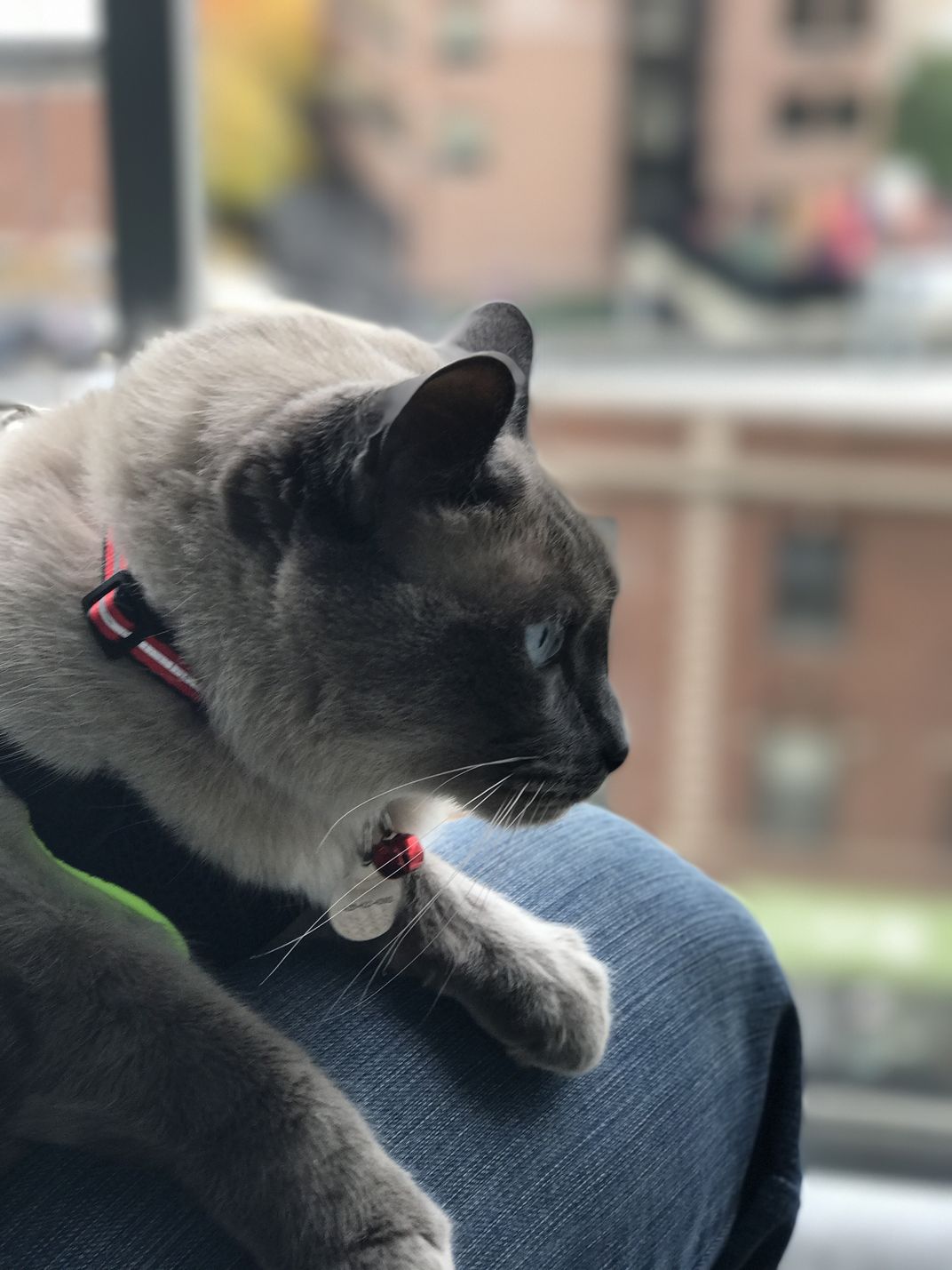 Indoor cat venturing on high rise balcony, refusing to venture off human's knee.
