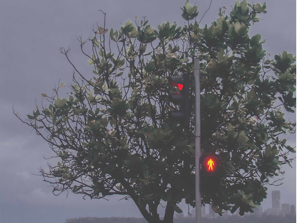 A solitary figure sits almost morose on the sea walk, his only company the orange figure of the pedestrian crossing traffic sign. They are an odd couple. the traffic figure orange bright and animated, the human dark, stationery, inviting the viewer to empathise with his pathos