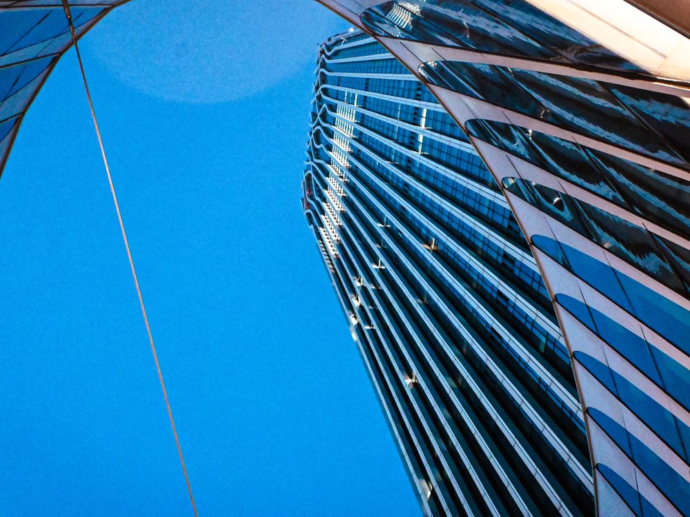 This photograph captures a modern commercial structure near NYU Shanghai in the Qiantan district of Pudong, emphasizing the contrast between circular columns and linear architectural elements. The repetitive spatial rhythm and clean geometry highlight contemporary urban design aesthetics, reflecting order, balance, and visual clarity in metropolitan architecture.