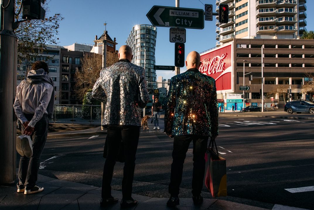 Two sequined figures disrupt the urban grey, their jackets exploding in color against the iconic Coca-Cola sign. This moment captures identity as theatrical performance and defiance.