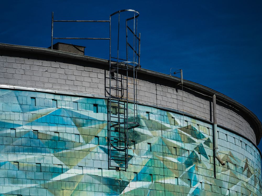 A striking curved water retention tank in Zielona Góra becomes an unexpected canvas for abstract aquatic murals in cyan and green. This utilitarian infrastructure transforms into contemporary public art, demonstrating how cities reimagine industrial structures as visual focal points and expressions of community identity.