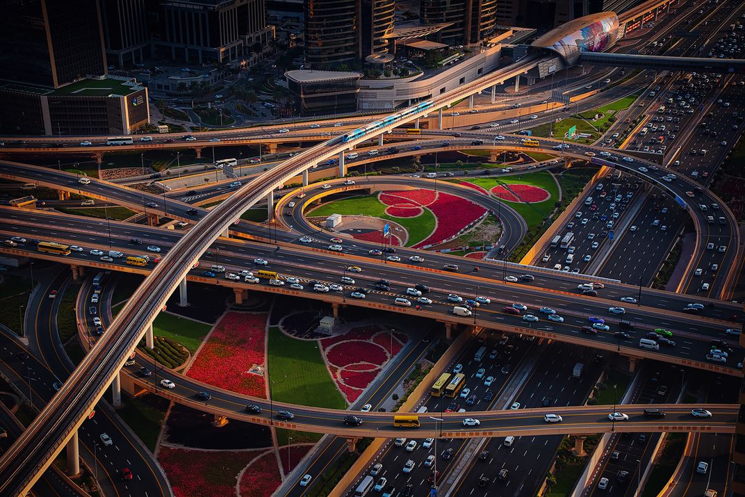 At sunset in Dubai, layers of roads, bridges and metro lines weave together in a flowing pattern of light and motion. The vibrant landscaping below adds a striking contrast, revealing the harmony between design, movement and modern urban life.