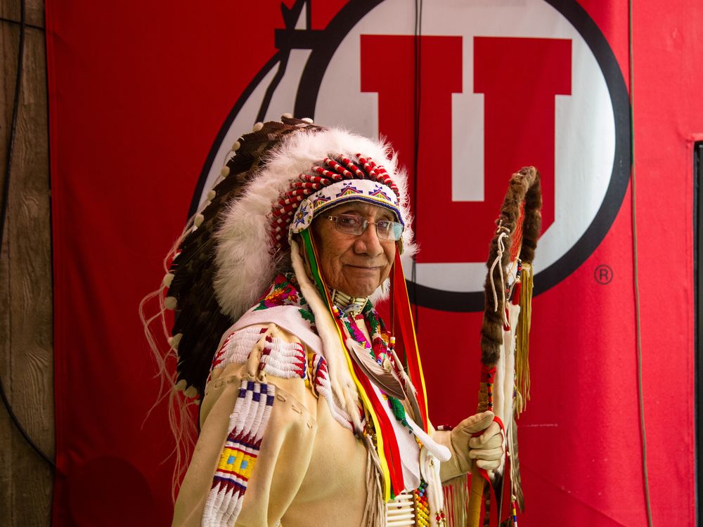 An elder of the Ute Tribe stands ready to enter the Grand Arena of the University of Utah Powwow, the University logo (Ute) behind him.