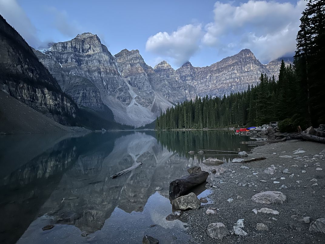 During the quiet morning minutes just before sunrise, the still waters of Moraine Lake reflect the surrounding peaks.