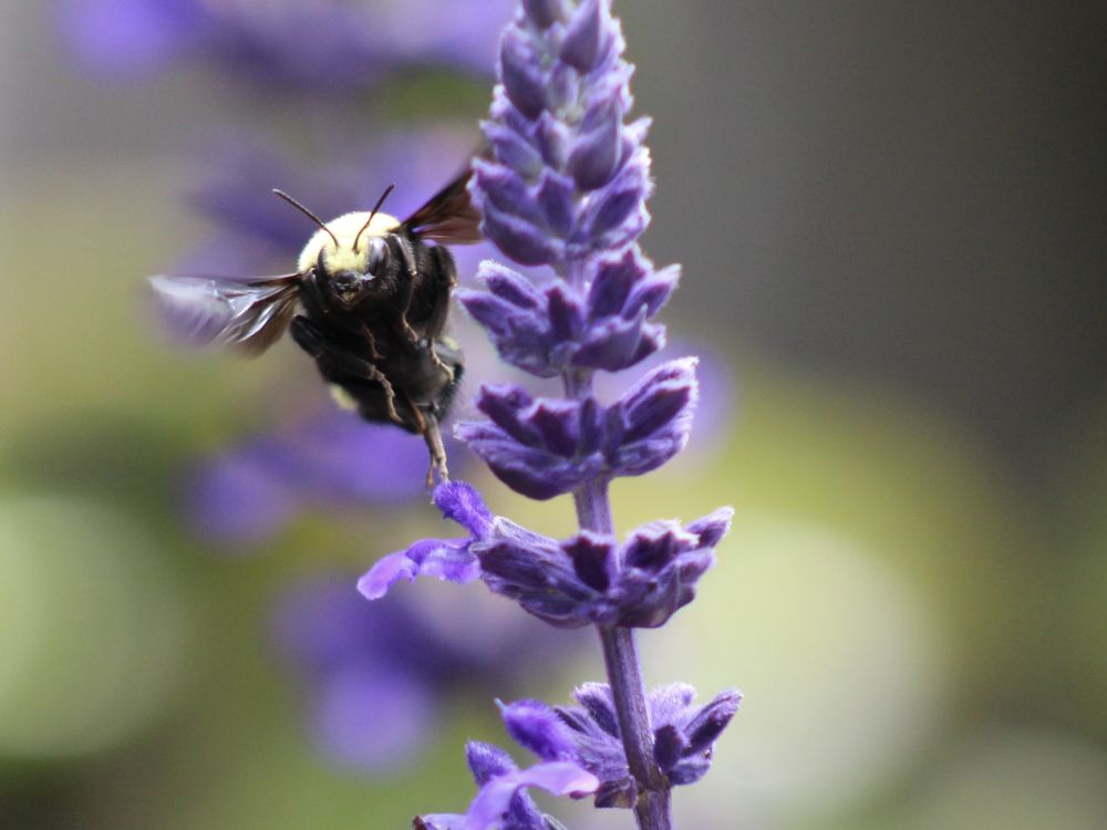 There were many black/yellow bees buzzing around my favorite lavender plant in my garden. There was a very plump black/yellow bee that hovered toward the top of one of the lavender plant branches. I captured this close-up photo of the hovering bee facing in my direction. I later noticed that a close-up of the bee's facial expression (or what I believe to be an "expression") showed what appeared to look like vampire teeth blended with a batman-like vibe. It's rare to see the face of an insect, especially a unique face that reminds one of a vampire or batman. This was a special moment for me, and am grateful to have captured an image of this special, beautiful bee (imitating a vampire, or a bat)!