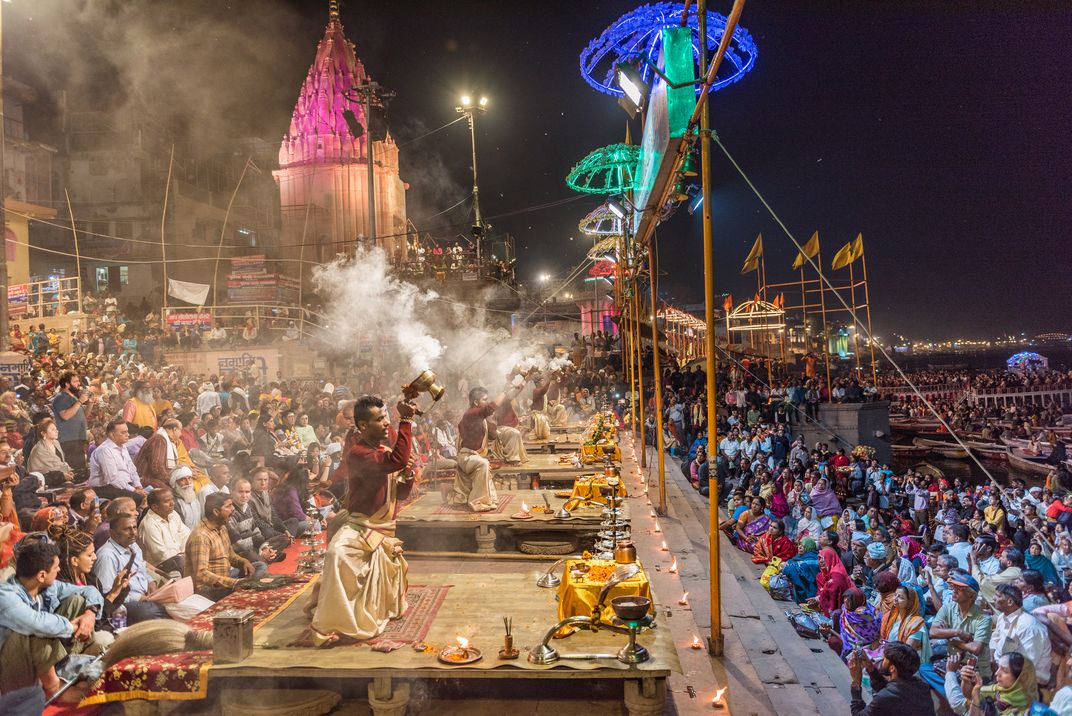 Caption: Varanasi Ganga Arti This is the famous Varanasi Ganga Arti being performed at Dashawamedh Ghat. Thousands pour on to the Ghats on every evening to watch this Puja through Arti to The Goddess Ganga, the river by the side of which Varanasi is situated. Varanasi is the oldest living city in the world and this Arti is the tradition of many hundreds of years. The colors, the grandeur and the show are having a great influence as it comes from a deep cultural heritage.