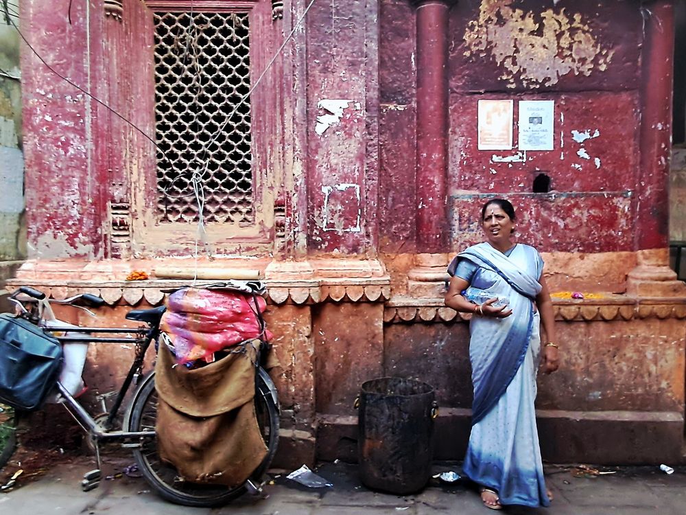Inside old Varanasi, unique contrast between colours of walls and sarees is always fascinating