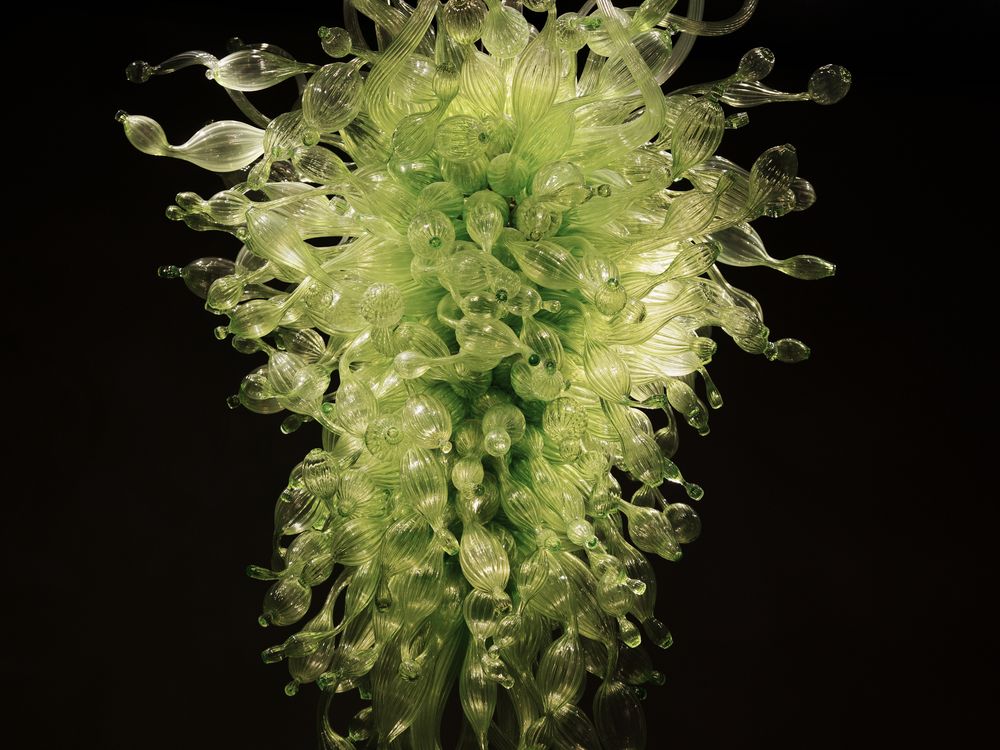 A chandelier of alien flora glows at Chihuly Garden and Glass. The translucent green tendrils twist like deep-sea kelp, suspended in a void of darkness, blurring the line between botanical life and glass art.