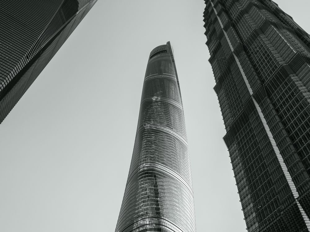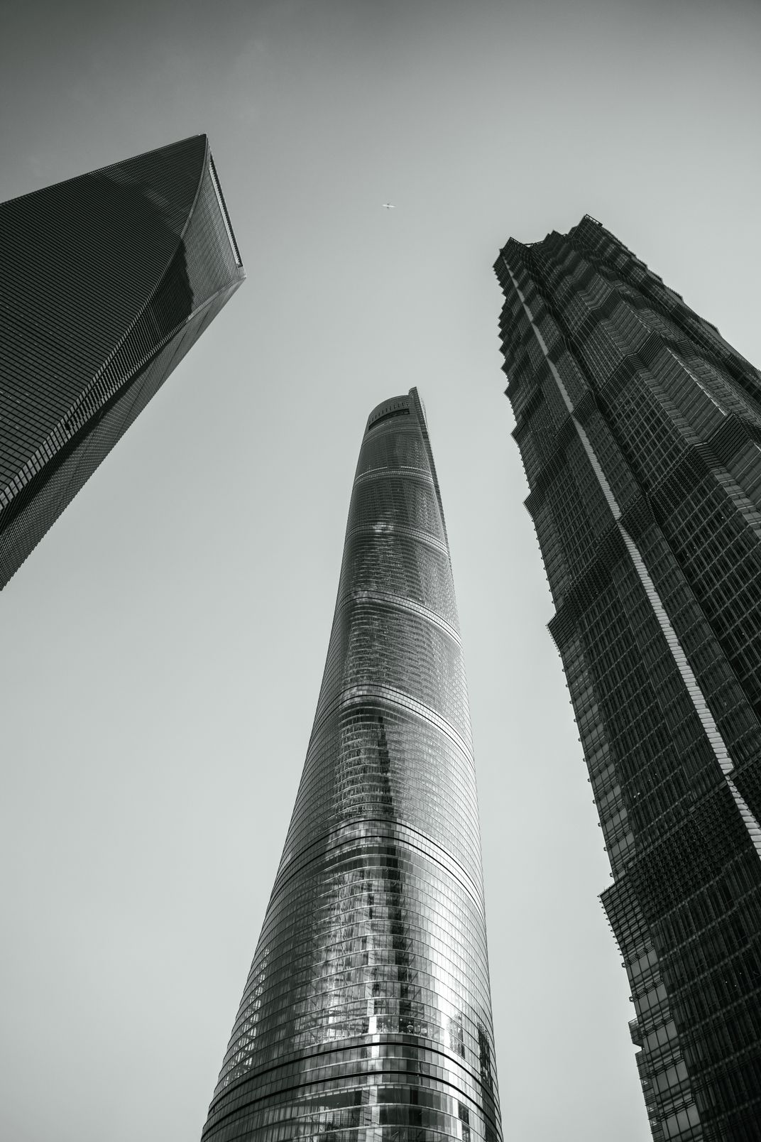 Three glass-and-steel towers surge from the frame, their vertical ribs and reflective facets slicing a pale, empty sky; converging lines drag the eye upward to a single, tiny airplane that punctures the stillness and gives the composition a startling sense of scale.