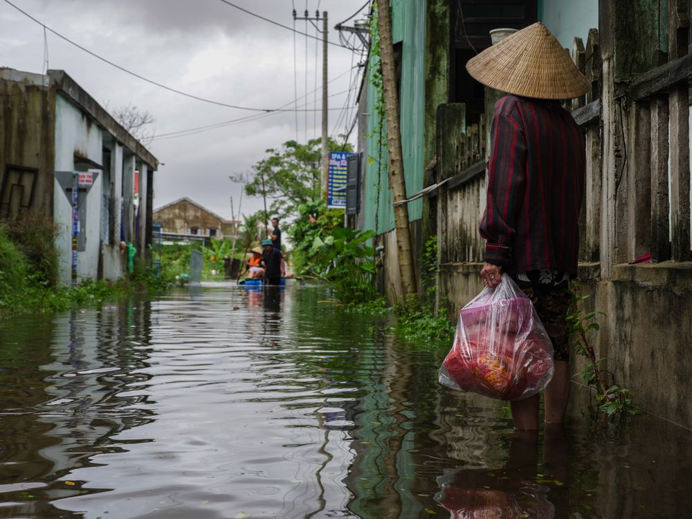 This year, the ancient city of Hoi An in Vietnam received some of its worst flooding in history, leaving thousands without shelter or access to basic goods. As the rains subside, a woman awaits local relief efforts in the submerged rural outskirts.