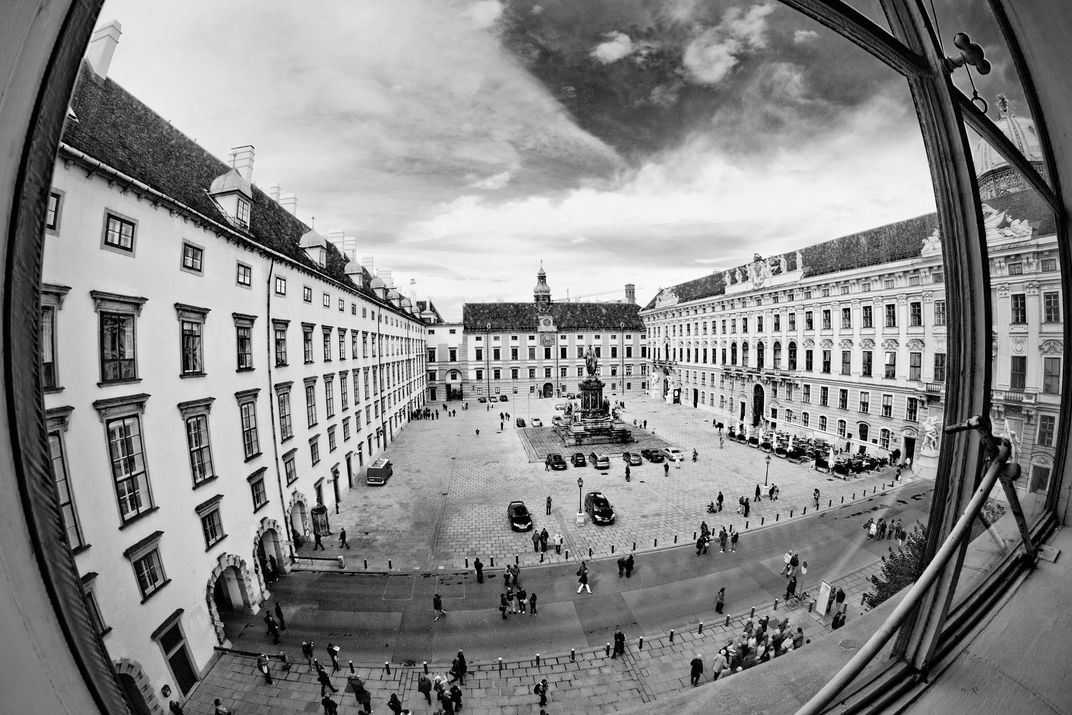 View from the President's Office into the grounds of the Vienna Hofburg (please neglect wrong entry with same oicture). Taken with a Samyang 8mm fisheye @ f/8, ISO 100, Canon Eos 40D