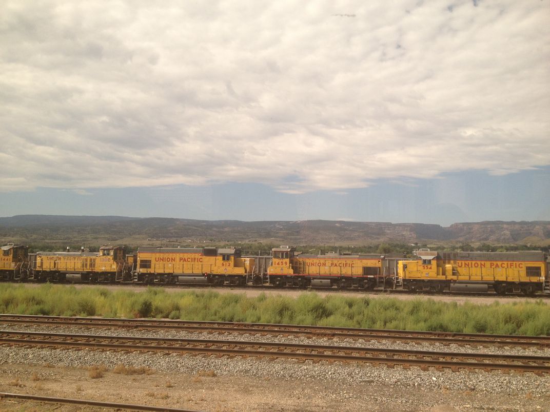View of a Union Pacific train in Colorado from the California Zephyr line.