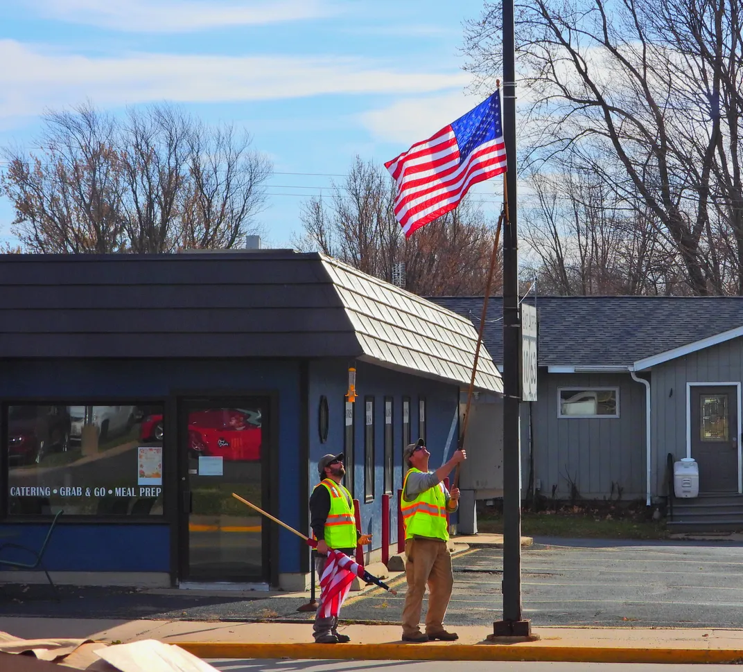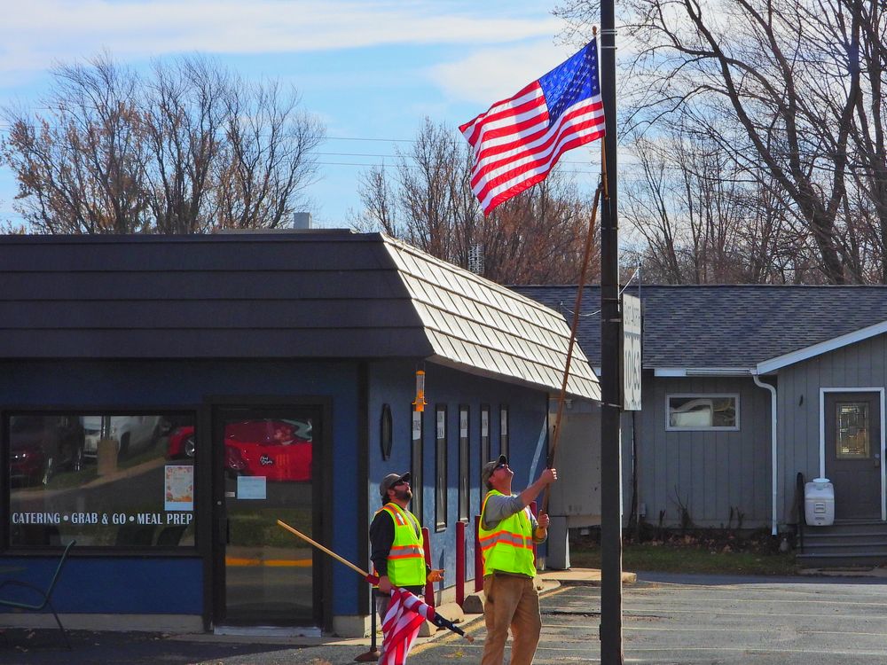This is a grab shot taken on 11/14/2023 across the street through an opened window of our car while parked at a Holiday Station. I captured one of the village workers at the precise moment taking down an American flag a few days after Veterans Day in preparation to put up Christmas decorations. I was able to capture this just in time before the red car that is reflected in the restaurants window next to these men passed in front of them.