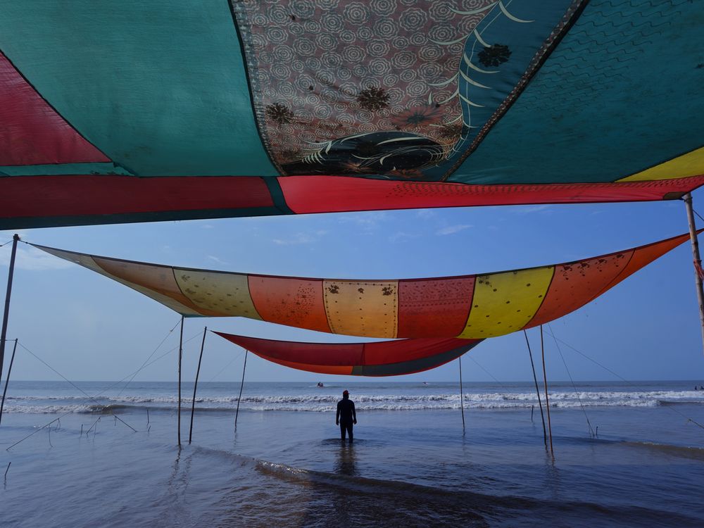 The beach becomes a canvas of colors, where traditional fabrics dance above the waves and the sea reflects stories stitched into every fold.