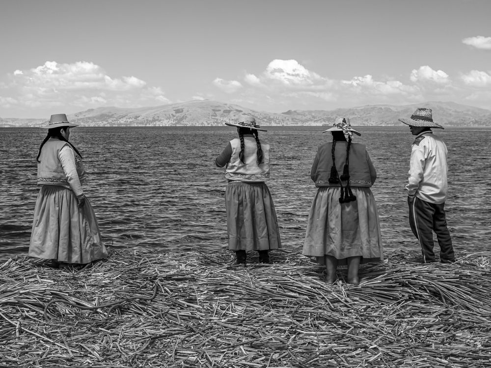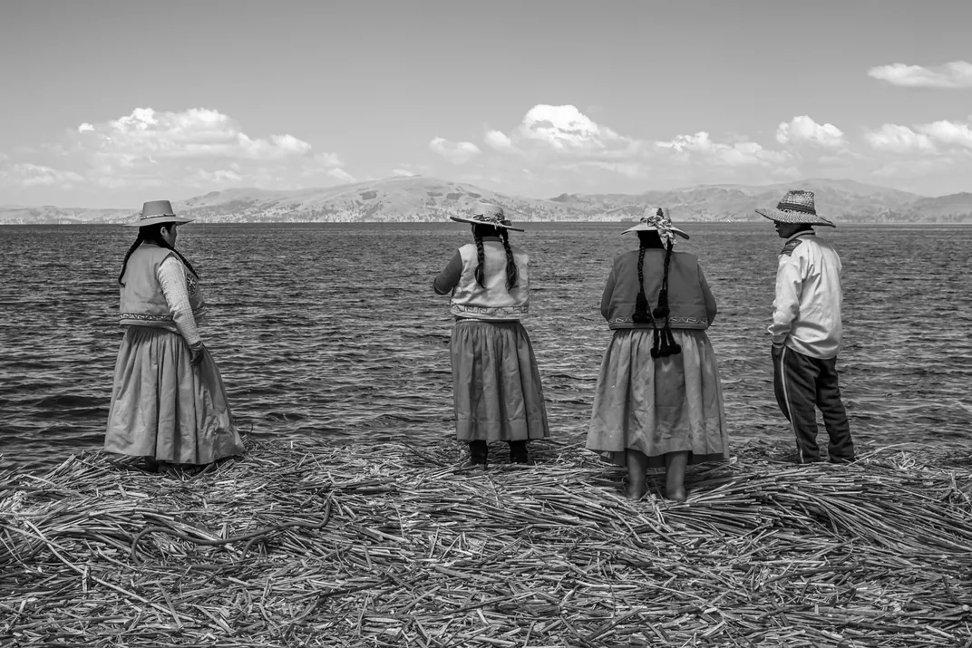 On the floating islands of Lake Titicaca, four Uros villagers stand at the edge of their reed island, looking out across the vast water. Their traditional attire and calm posture reflect a life still connected to ancient traditions, where the lake remains both home and horizon.