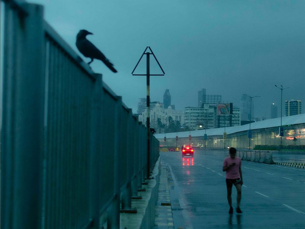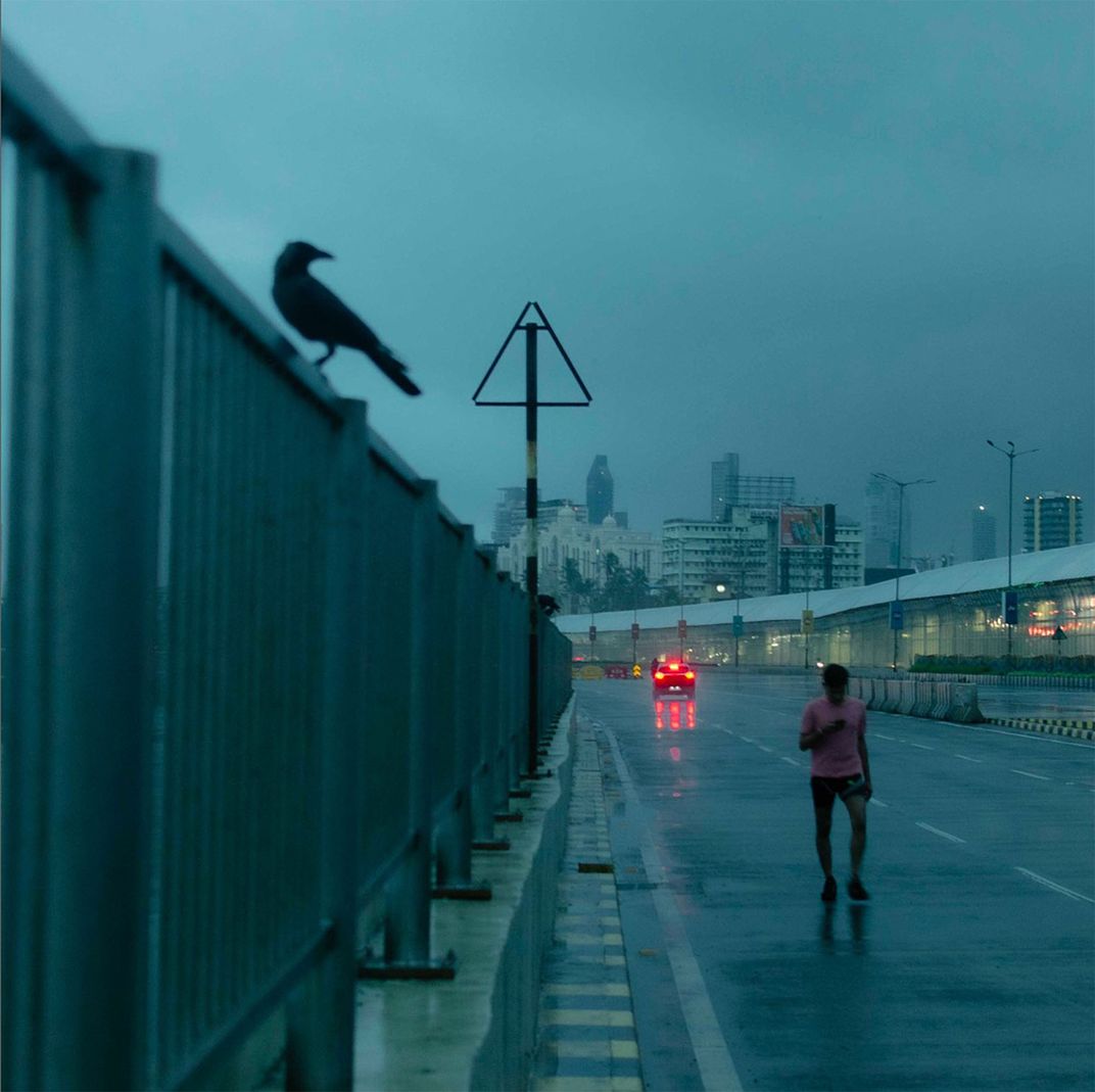 The crow, the blank stop sign and the passerby lost in his mobile phone all add up to a large void that signifies the sum total of our urban existence. The shades of blue and green accentuate the mood of melancholy and hopelessness.