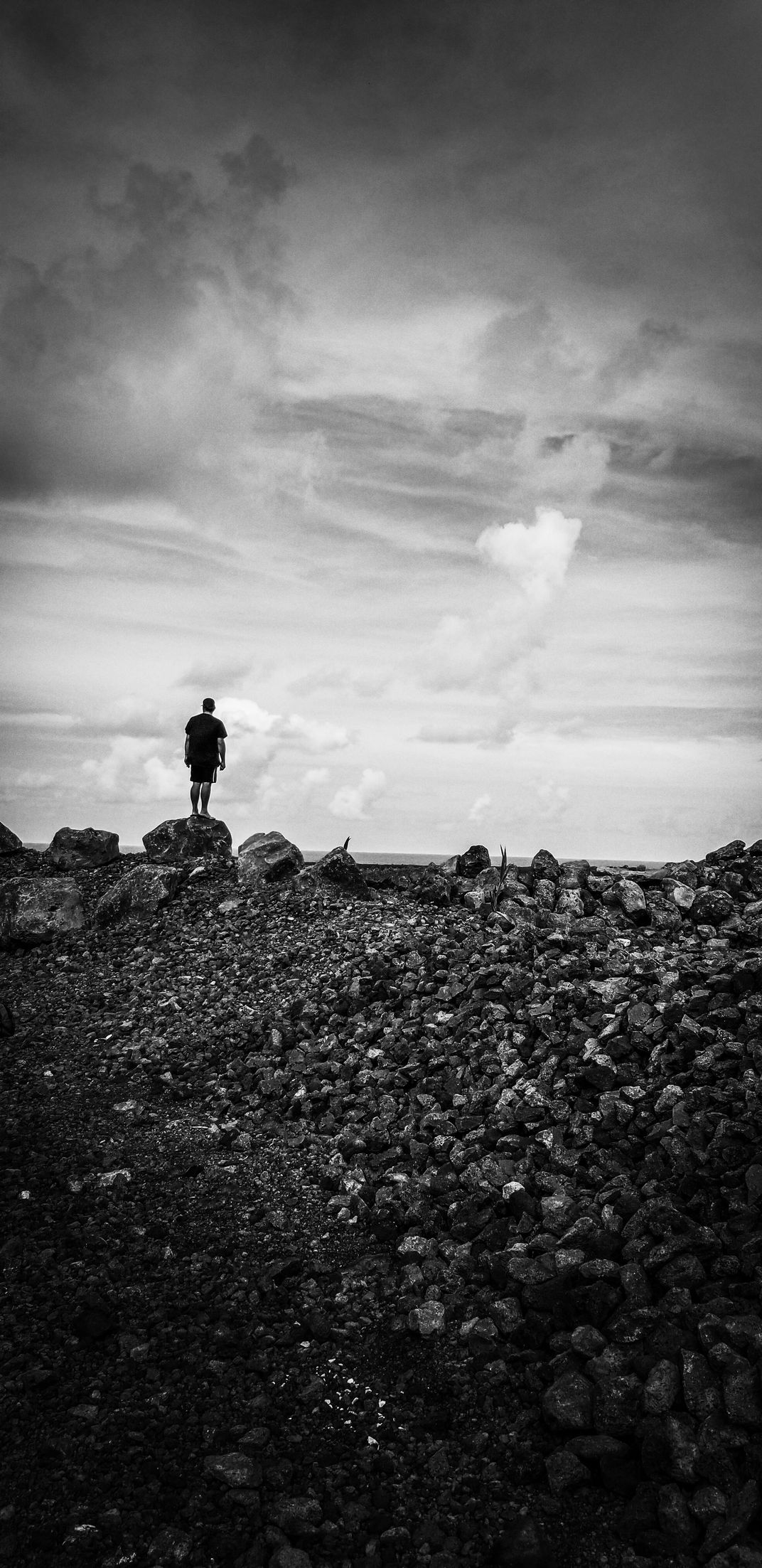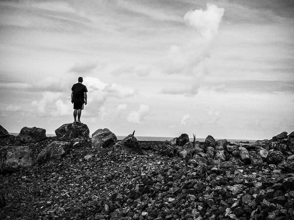 This photo I shot on Big Island, Volcano, Hawai'i. that is my friend Doug standing on volcanic lava rocks from the eruption back in 2018. He was looking out towards an area where there was once a village, until the volcano eruption wiped out the entire village.