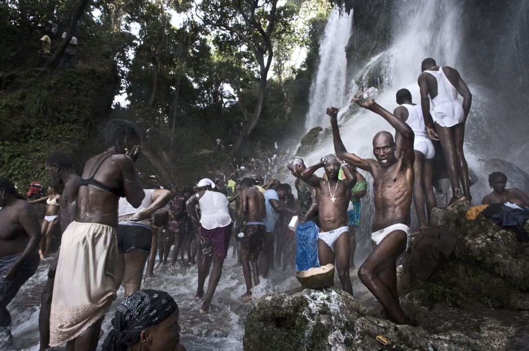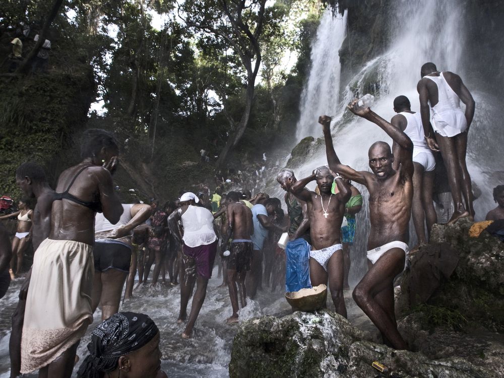 HAITI, VILLE BONHEUR, Climbing to the waterfall of Saut d'eau, a height of 30 meters is not easy. Like her, the pilgrims are directed at Saut d'Eau to attend the first of the three Catholic-voodoo celebrations that attract people from all parts of the country and all social classes. During the remainder of Haitians practice ceremonies in temples called colonnades, which are a kind of sheds containing an altar decorated with paintings Iwa and images of Catholic saints with stones, bottles and tied Ron Barbancourt herbs. In the middle of the peristyle stands a mitan poto (central post), the axis between the heavenly and the earthly world and the point where the Iwa enter the enclosure. The colonnades are devoted to a particular branch of Iwa and decorated in keeping with paint on doors and walls and flags collage.