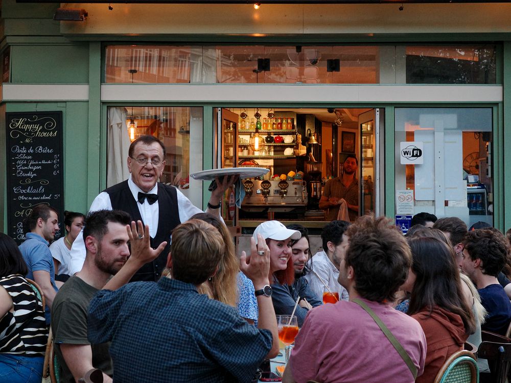 A professional waiter holds a tray of drinks, expertly navigating the animated outdoor terrace of 'Le Maryland' in Paris. As the sun sets and the neon sign lights up, the tables are filled with friends sharing aperitifs and laughter, embodying the quintessential Parisian evening life.