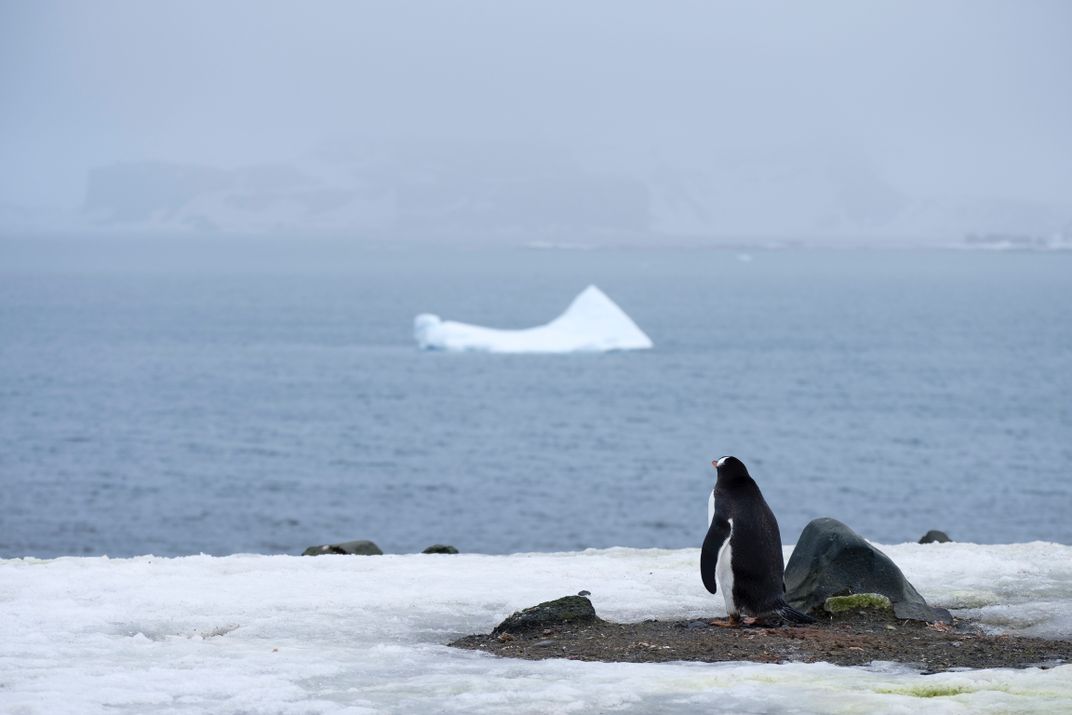 A Gentoo penguin watches as his mate heads to sea to feed. He will stay behind to start building their nest on this patch of ground they have selected. When she returns, she will lay 1 or 2 eggs and sit on the nest while he takes his turn to go feed.
