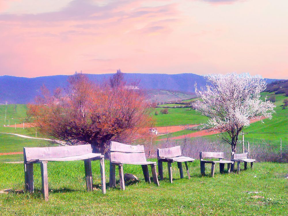 The photo shows benches in a Cemetery in a lush village in Iran for visitors to rest.