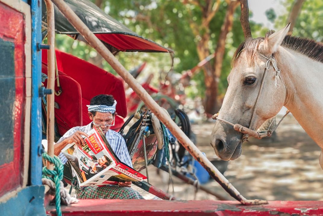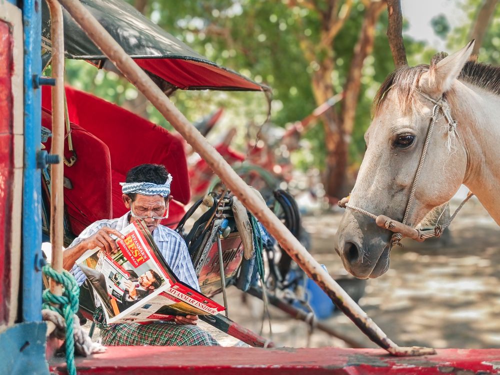 An elderly carriage driver sits calmly and reads a magazine while waiting for his next passenger. Beside him, his horse stands quietly in the shade. The red seats of the traditional horse cart and the soft green background create a peaceful scene, showing a quiet moment in everyday life.
