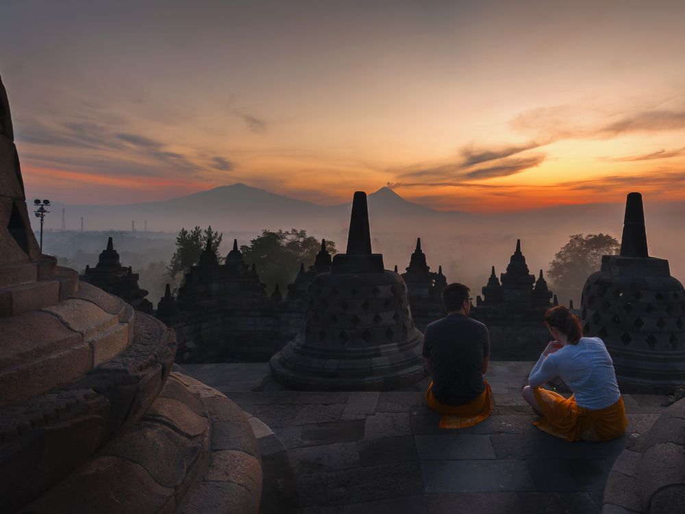 I saw this couple when I turned around while setting my gears to take sunrise scenery. I just made a quick shot as not to disturb them from enjoying their view. It was indeed a beautiful sunrise on that day. Borobudur Temple Indonesia