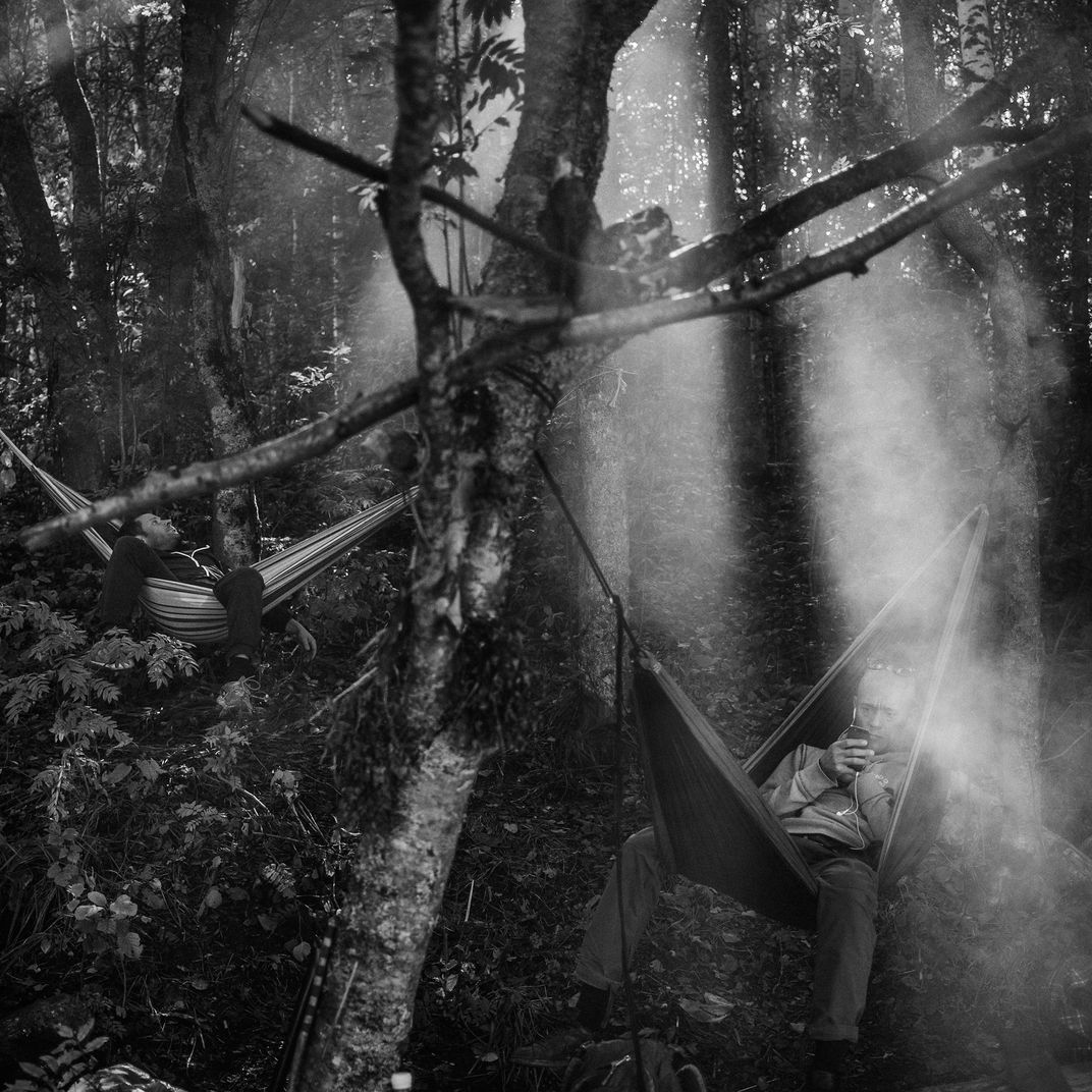 Two men lies on hammocks and waits a tent sauna to be warm in Jyväskylä, Finland.