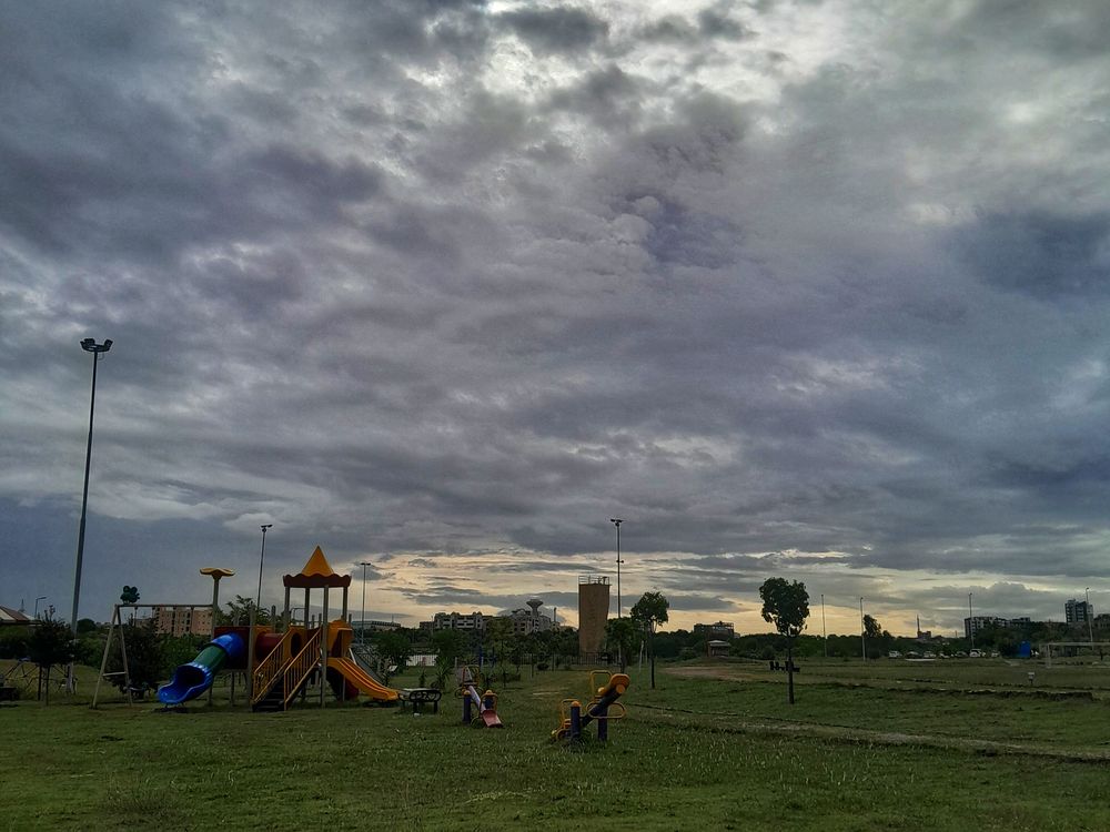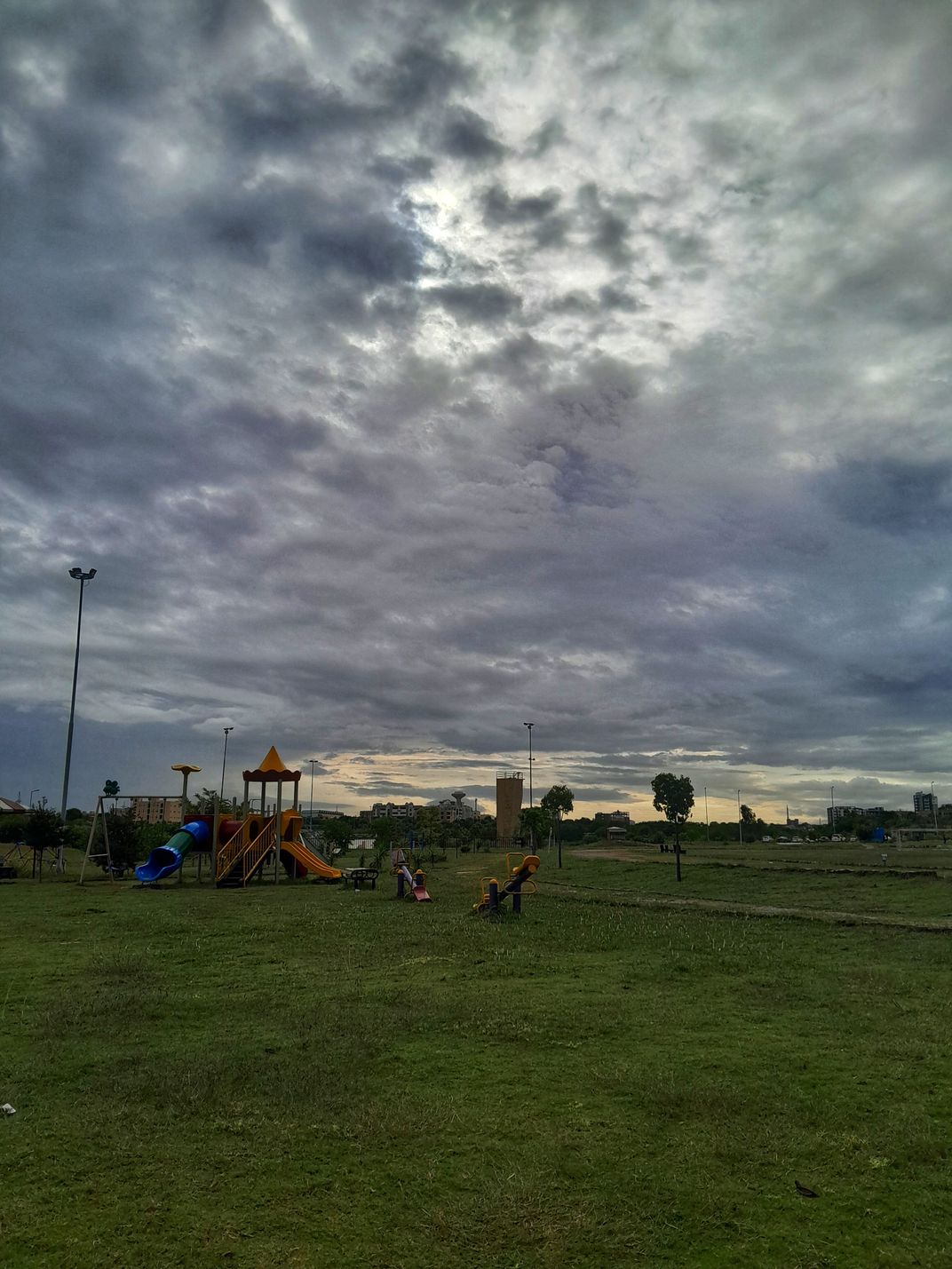 The playground on a rainy day glistens with fresh puddles, inviting children to leap and splash with sheer delight. The swing sets and slides may be slick, but the joy of sliding down a wet slide and the thrill of swinging through the raindrops make it an unforgettable adventure. Laughter echoes in the misty air as young imaginations turn a wet day into a playground paradise.But for ones who have grown out of their childhood,the rainy sky reminds them of the old happy days.