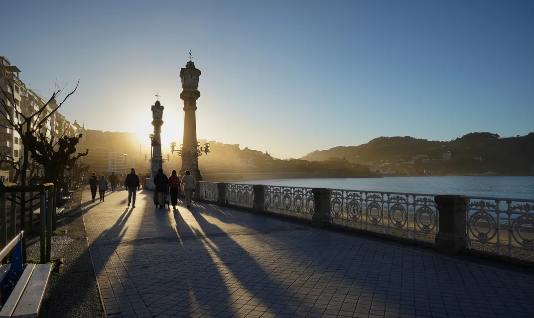 this picture shows the promenade of the Concha in San Sebastian. This town is a very beautiful place on side of ocean. we went in San Sebastian for Chrismas. there is lot of culture traditions as we are in Basque country. beautiful light with long shadows of people and pillars.