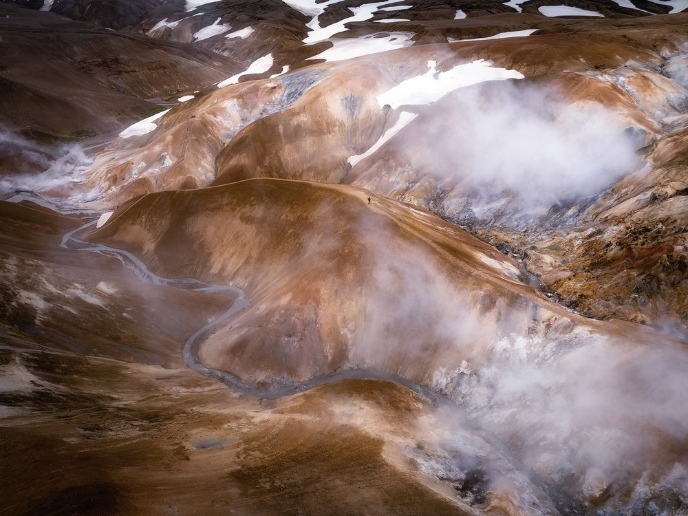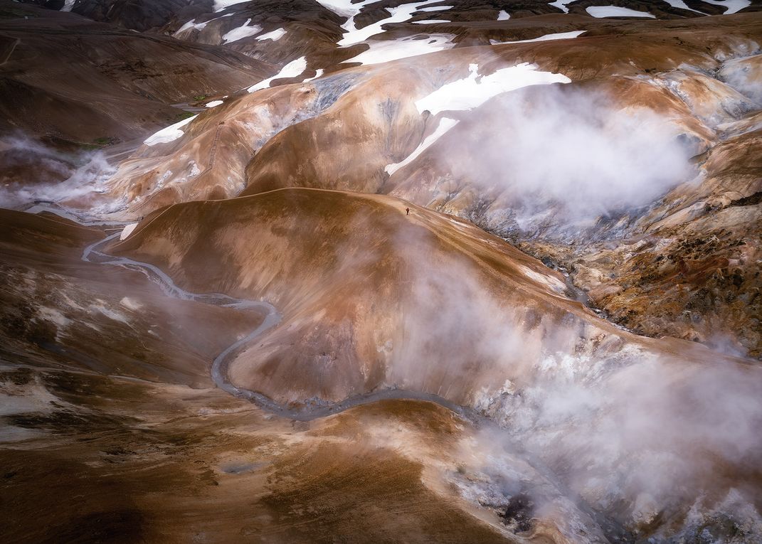 A valley of steaming mineral hills and lingering snow in Iceland, with shifting copper, silver, and white tones. A lone hiker in red emphasizes the vast scale and raw beauty of the geothermal landscape.