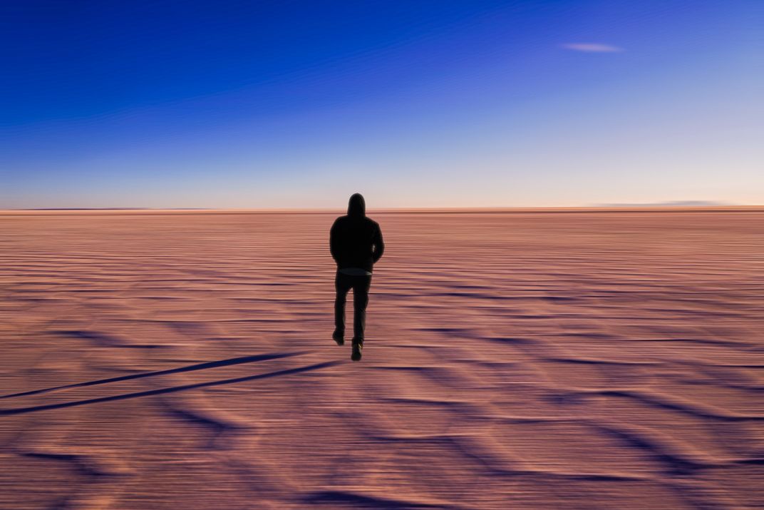 This is Uyuni desert in Bolivia, it the biggest salt desert in the world, and it's like you are in another world. My son was walking and I took the picture of him from the behind.