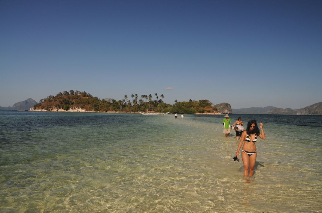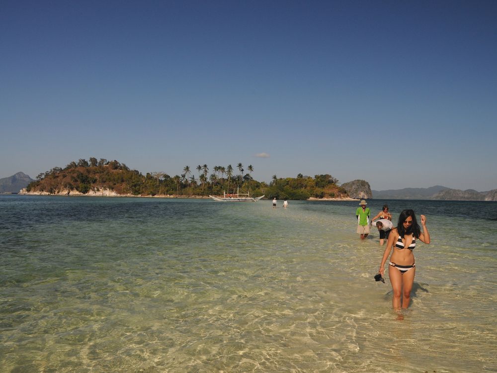 Walking the sand spit connecting to Snake Island, Palawan, Philippines at low tide.