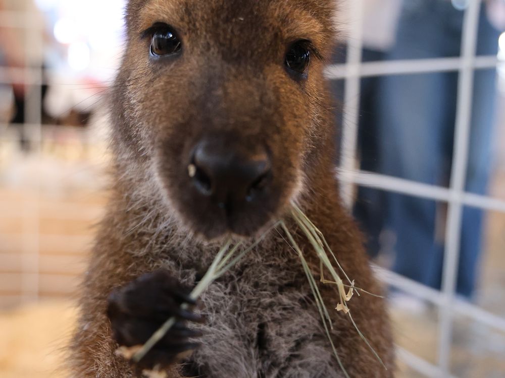 An adorable Wallaby eats hay and poses for a photo unprompted.