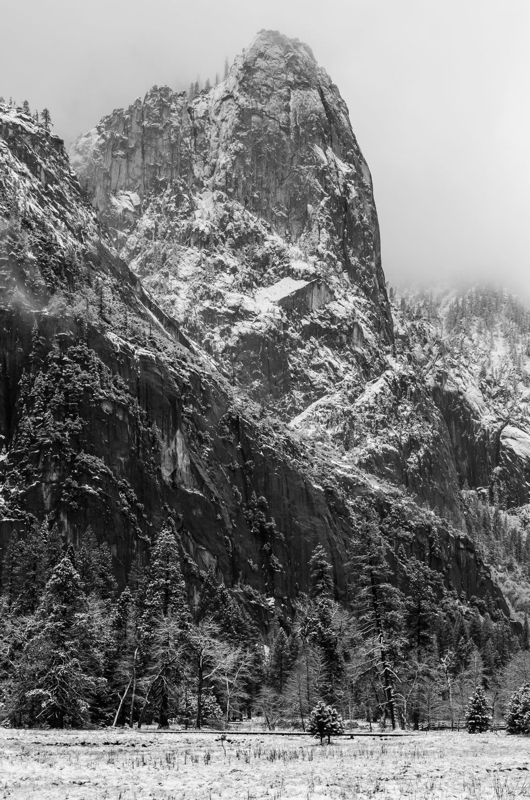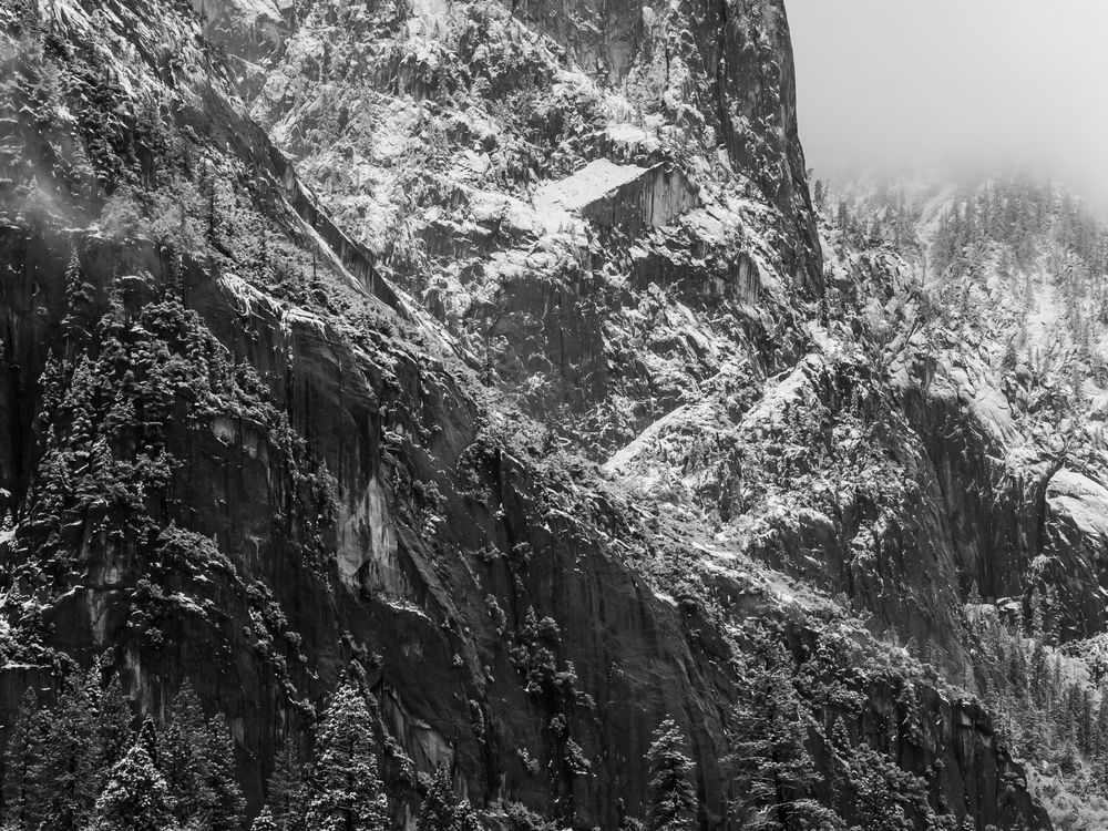 An early snowfall in the Yosemite Valley. Light snow rests delicately on the cliffs of the magnificent granite valley walls in the National Park.