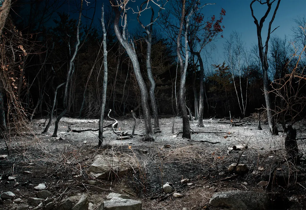 Aftermath of wildfires on a forest, shot at night with a long exposure and lighting applied to the landscape