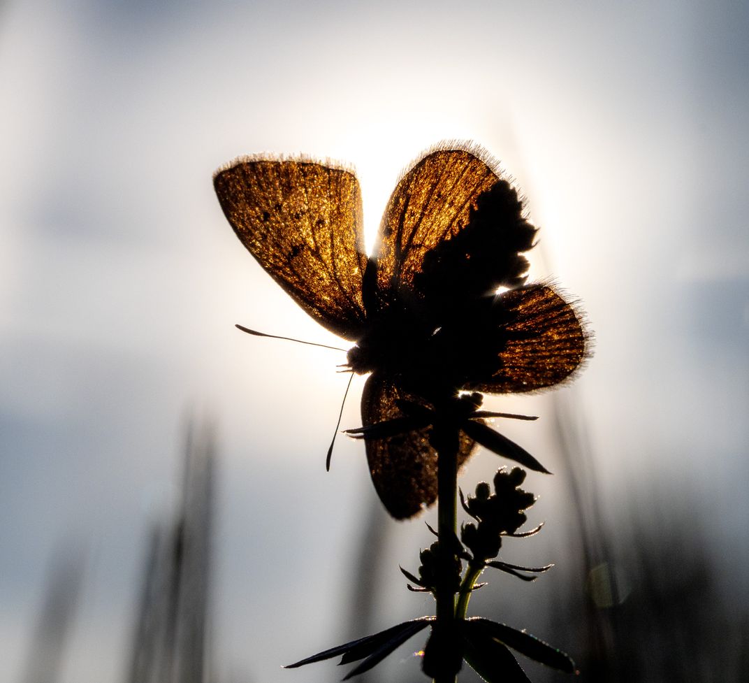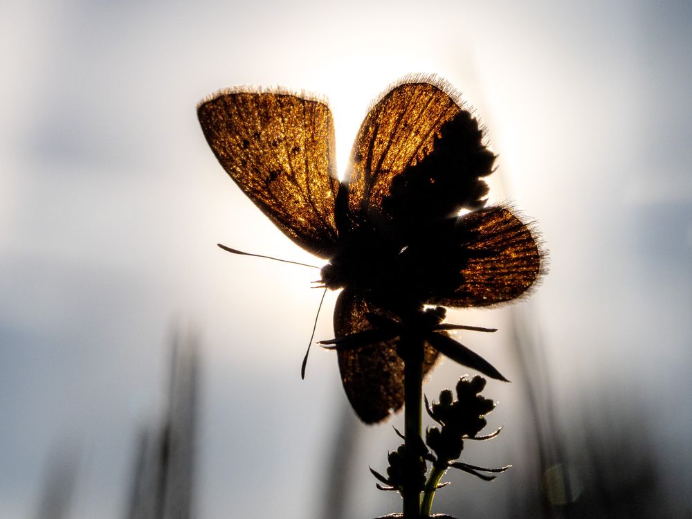 A common blue butterfly warming itself in the morning sun. From below and with the sun behind them they appear in brown color.