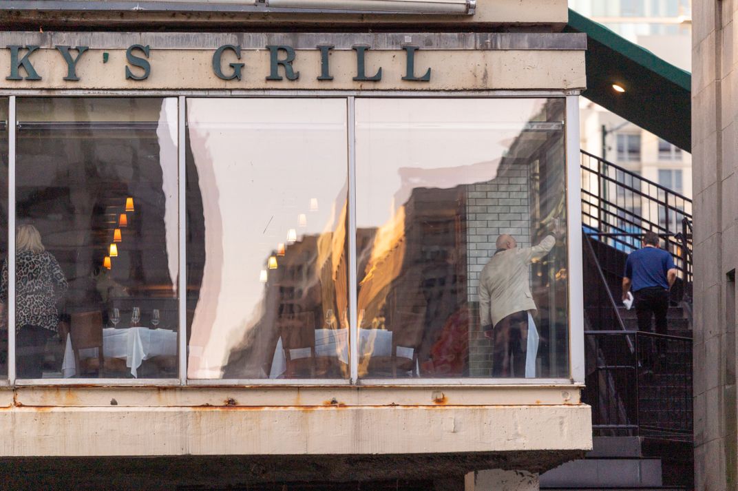 While on an architecture cruise along the Chicago River, I passed a restaurant with large glass windows that overlooked the water. A worker inside was cleaning the glass, and the riverfront buildings reflected across the window in distorted, wavy patterns. The moment mixed the city’s iconic architecture with an ordinary job, capturing a small slice of daily life along Chicago’s waterfront.