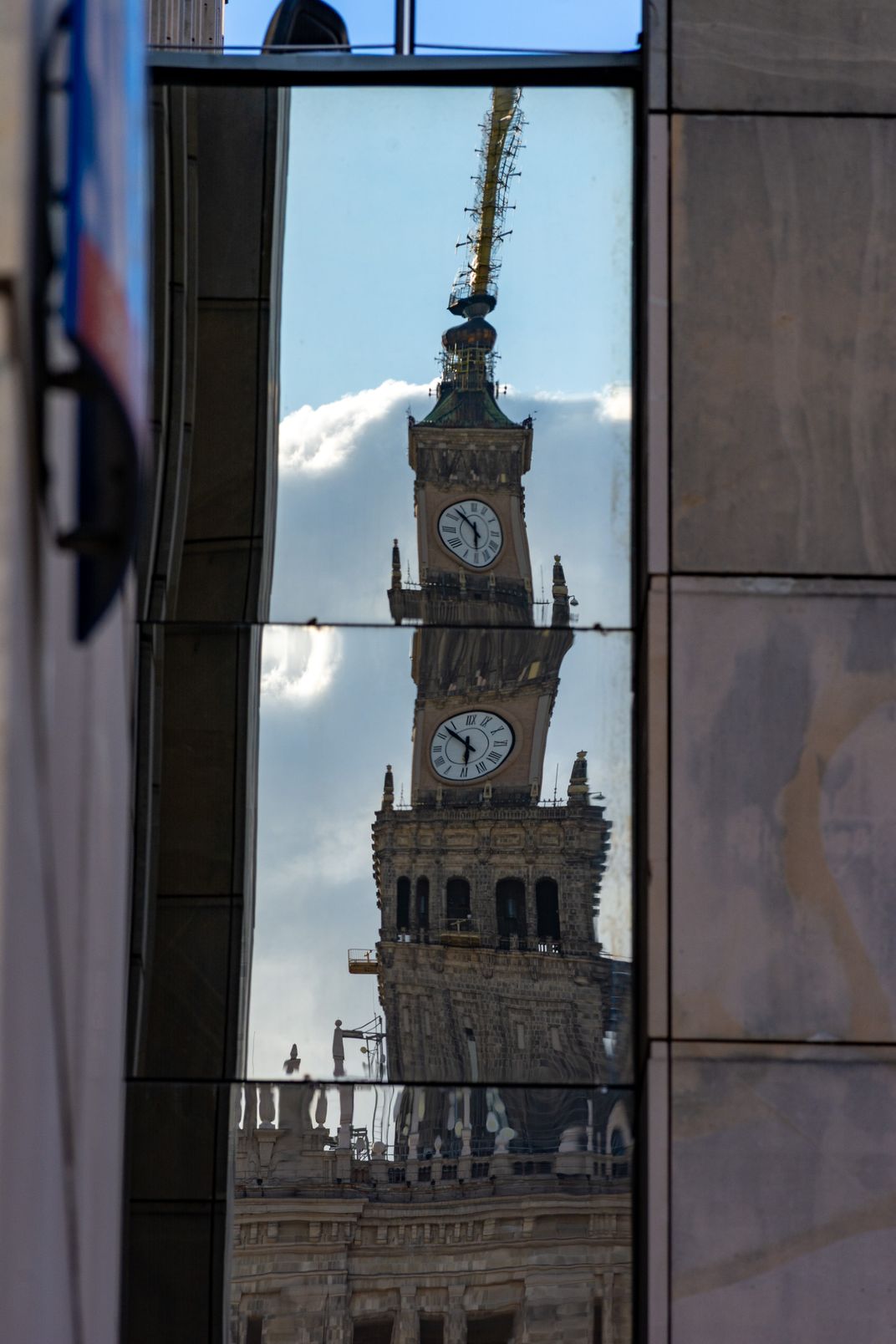 In central Warsaw, the clock tower of the Palace of Culture and Science appears only as a reflection, bent and stretched in the warped glass panels of a modern building, as if the city were quietly reshaping its own past.