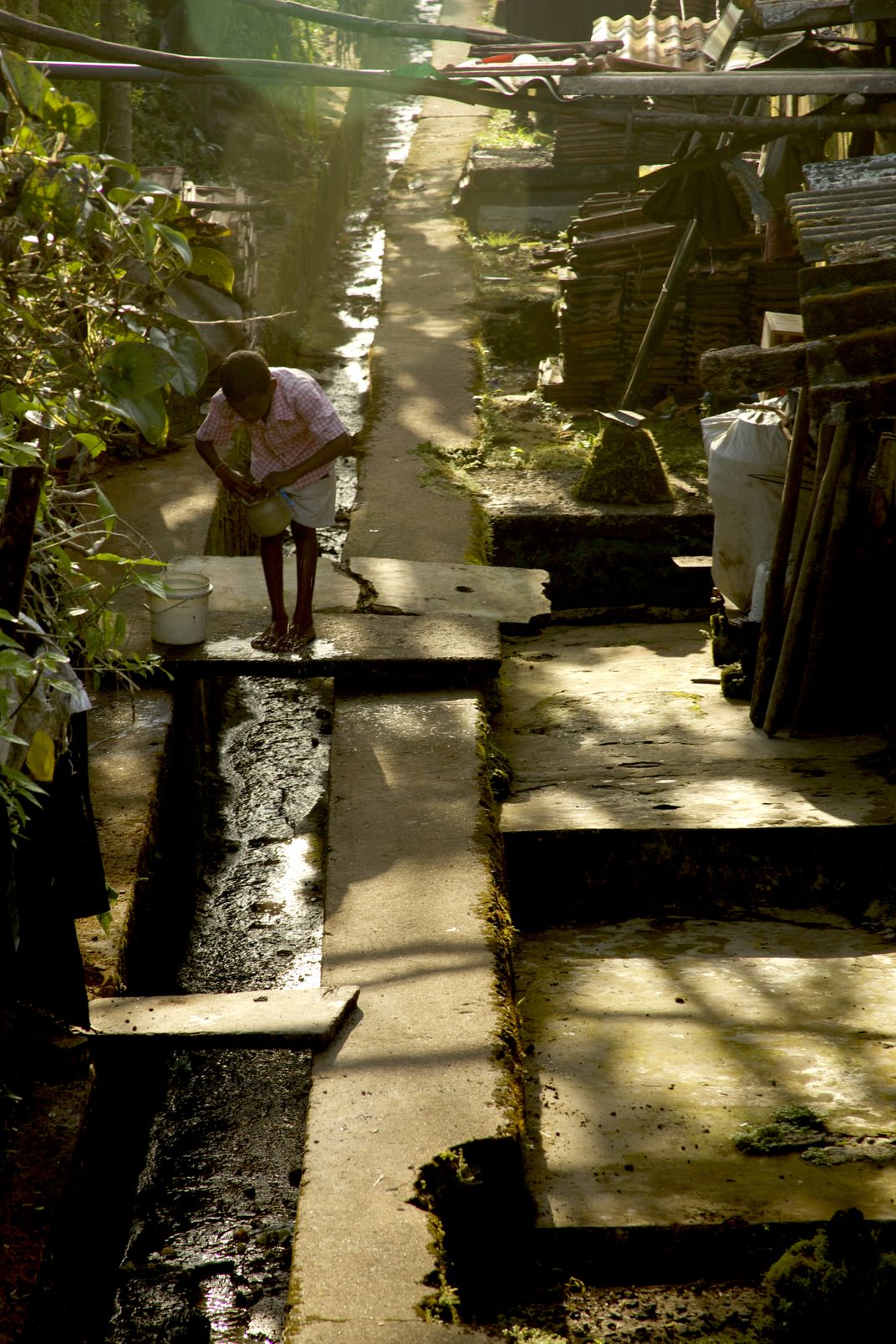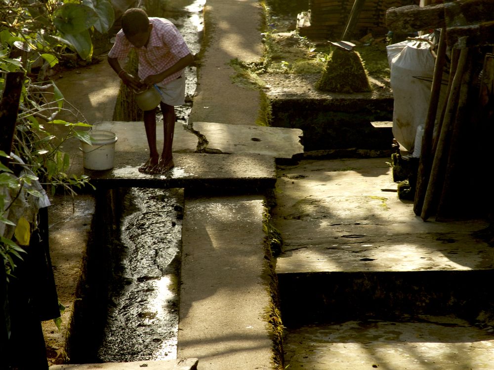 The boy who washes his mouth in the morning still knows where to do so in order to save the maximum water.