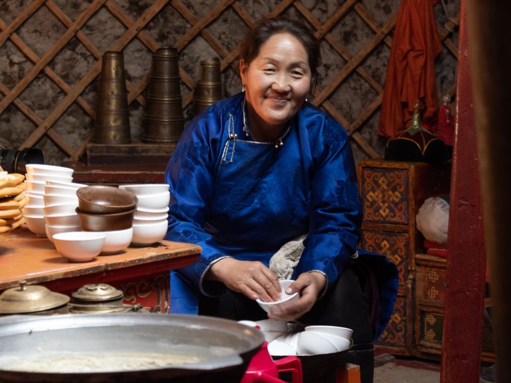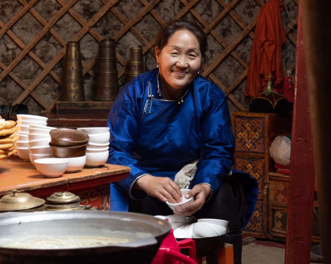 We visited a folk Ger Camp to learn about Mongolian nomads. They treated us to milk, vodka, and pastries they made. We learned games and watched the nomads make rope, and lead the livestock on a pretend move. This woman helped with the program. She has a very nice smile and was very happy to welcome us photographers.