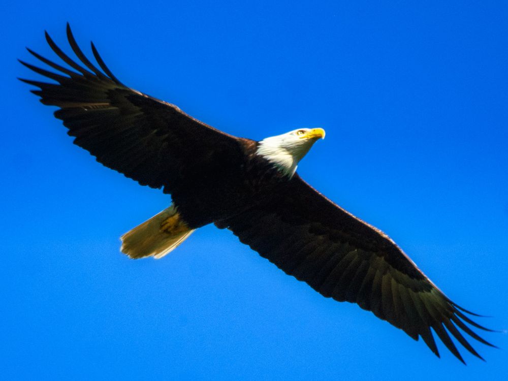 The photograph is of a Bald Eagle flying overhead. The sky is a deep blue which contrasts with the eagles brown and white plumage. The eagle has a stoic look on its face.