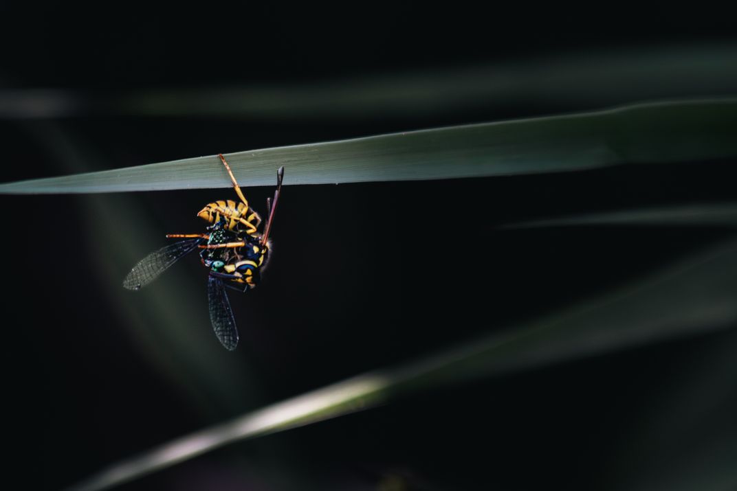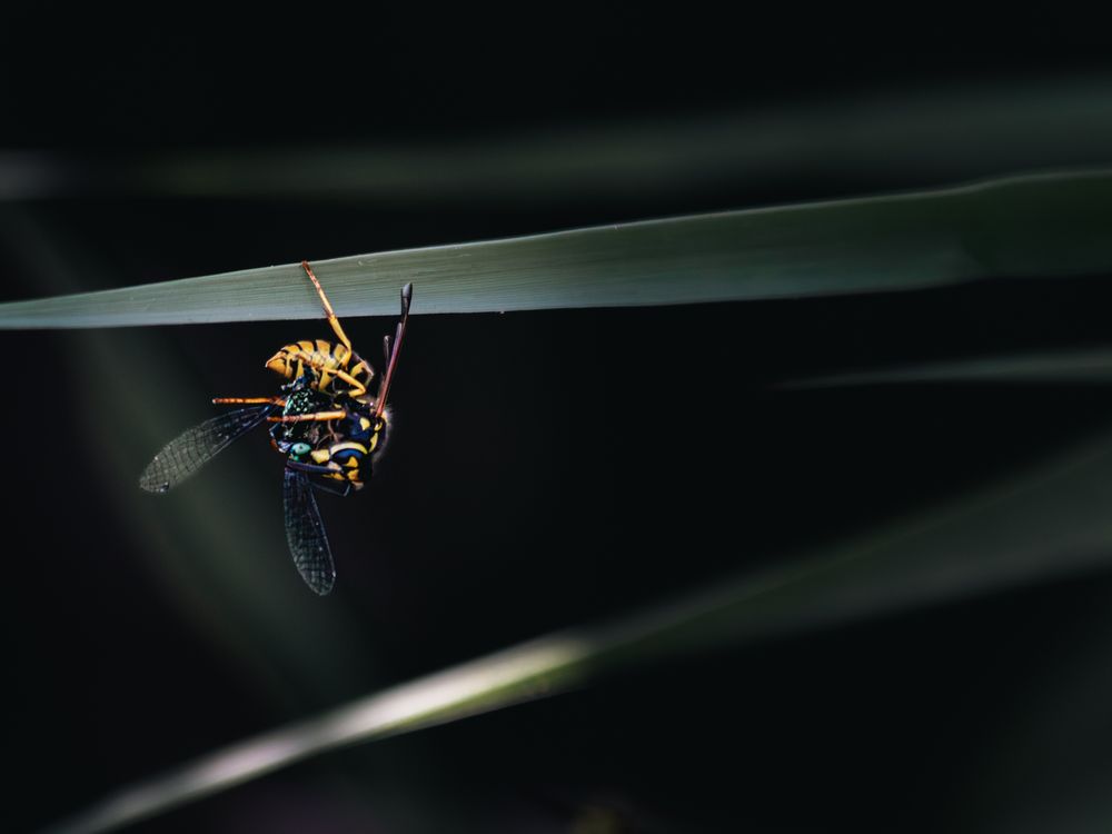 This photograph captures a wasp feeding on a dragonfly, suspended beneath a leaf in the "Ciane's river" reserve in Sicily. The moment is raw and precise: the predator hangs upside down, its yellow-striped body sharply outlined against the dark background, locked in a ritual of survival. The composition is visually striking, but it also reveals the brutal elegance of nature, where beauty and violence coexist. This image is not just about form; it’s about instinct, necessity, and the quiet tension between life and death.
