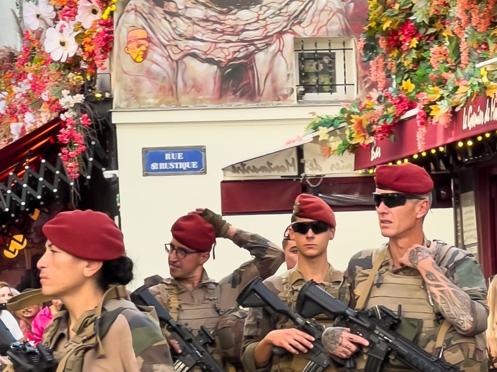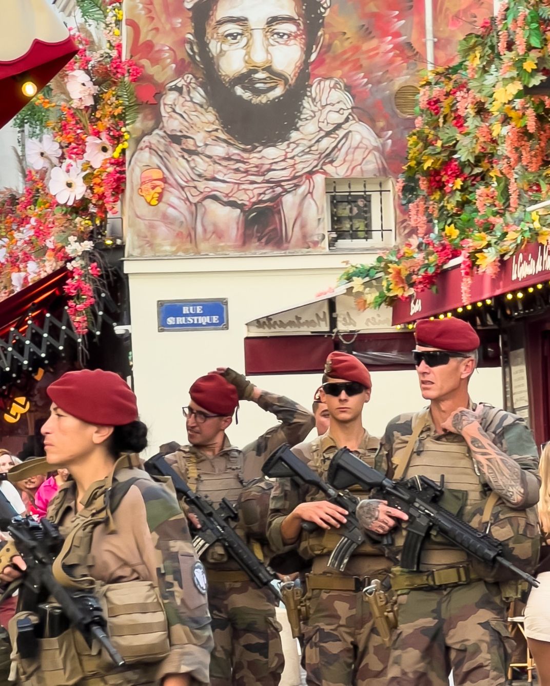 While in France, I saw some police approaching and found the mural behind them attractive for its matching color to their berets.