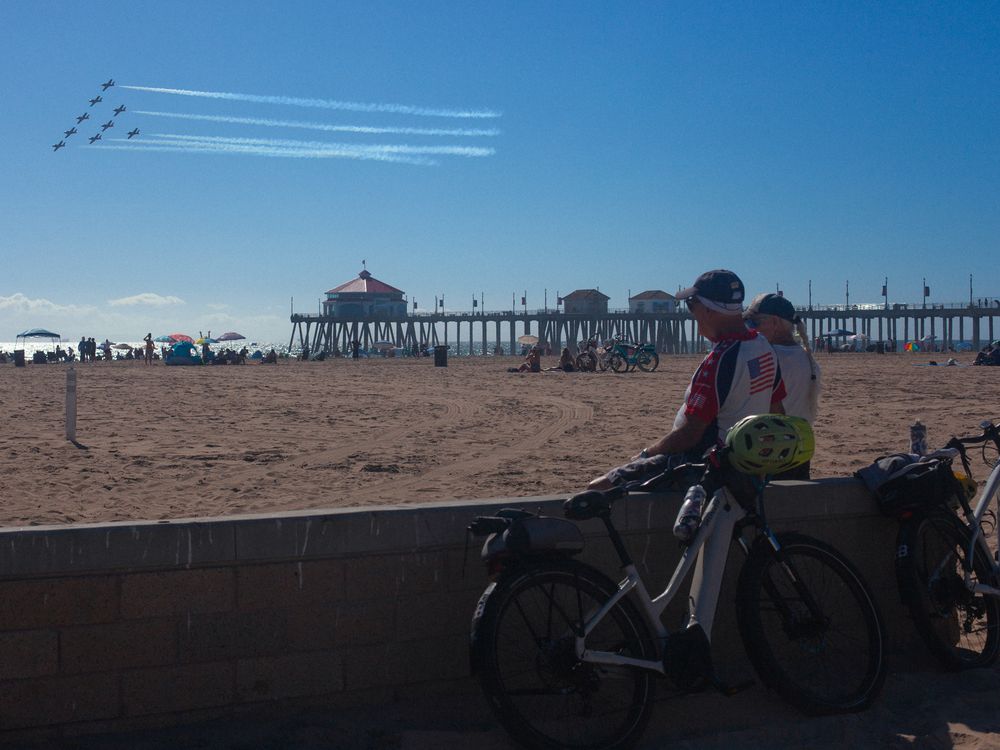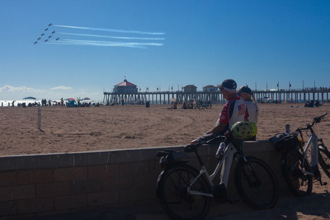 Spectators at Huntington Beach watch the Pacific Airshow from the sand, taking a break beside their bikes as the aircraft pass in formation above the pier.