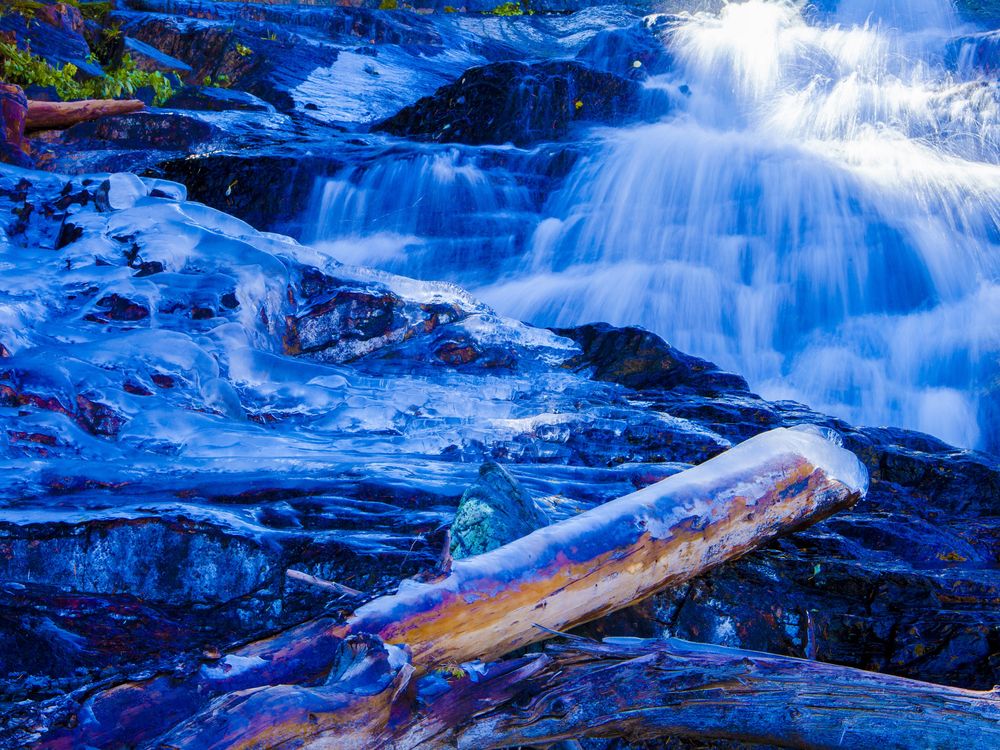 Cascading water in the fall with ice and cool tones of the late afternoon.