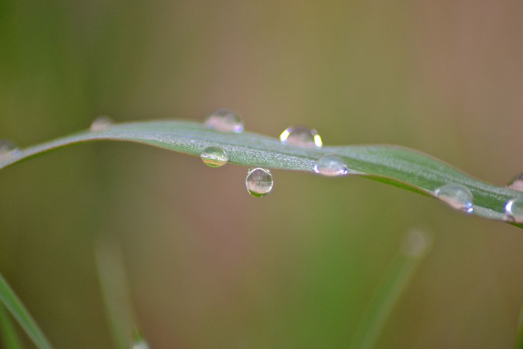 I had been wanting to take some photos of the morning dew with my new macro lens. After much searching, I found this blade of grass. That dark spot in the middle of the droplet is my reflection.