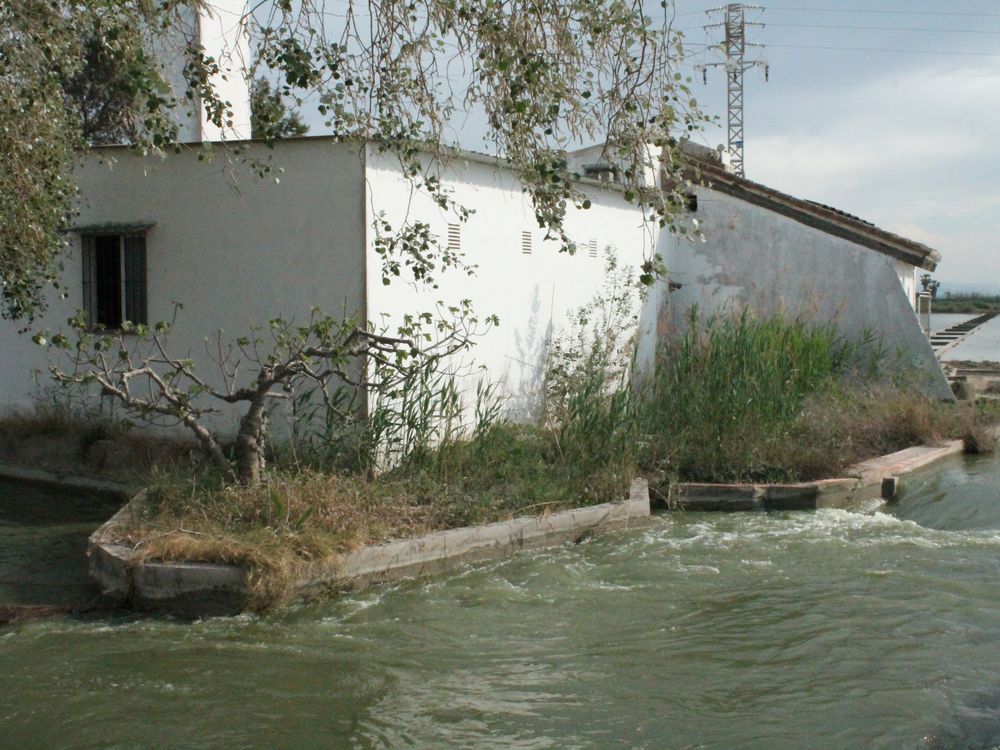 A white building stands at the junction of La Albufera’s canal system. Flowing water, reeds, and bare branches frame this rural infrastructure, where rice cultivation meets seasonal flooding.