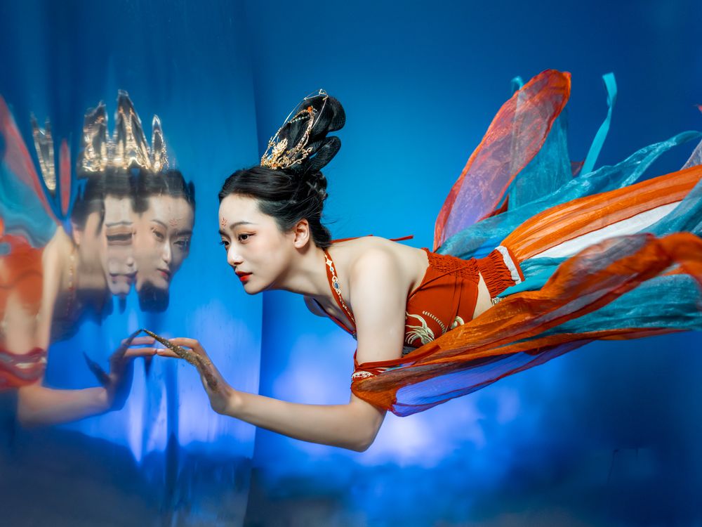 A beautiful Chinese water angel at the border of the spirit and human realm. She wonders about the mortal world and how it feels to fall in love with a man. [This is a 1-exposure photograph with no overlaying of images.]